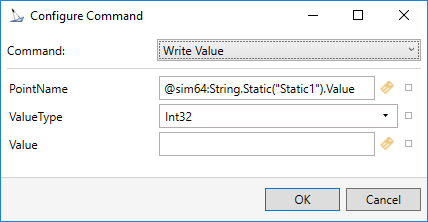 5. Configure the Write Value command to write a blank string to @sim64:String.Static("Static1").Value. This tag will store the result of our batch. Click OK when done.