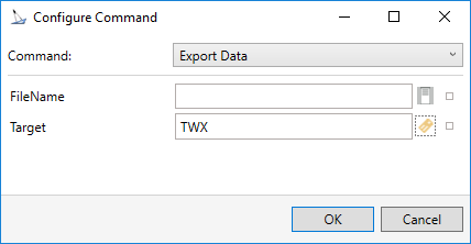 The command for this step is going to be Export Data. Leave the FileName blank, but put the name of our TrendWorX64 Viewer, TWX, as the Target. Click OK.