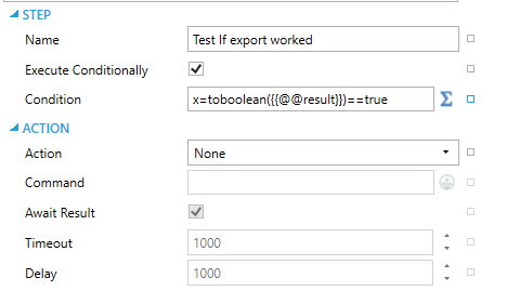 Add a new step called Test if export worked. This step will check the result of the previous step. Configure it with the following settings: