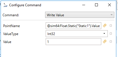 For the Write Value parameters, choose a PointName of @sim64:Float.Static("Static1").Value and a Value of 1.