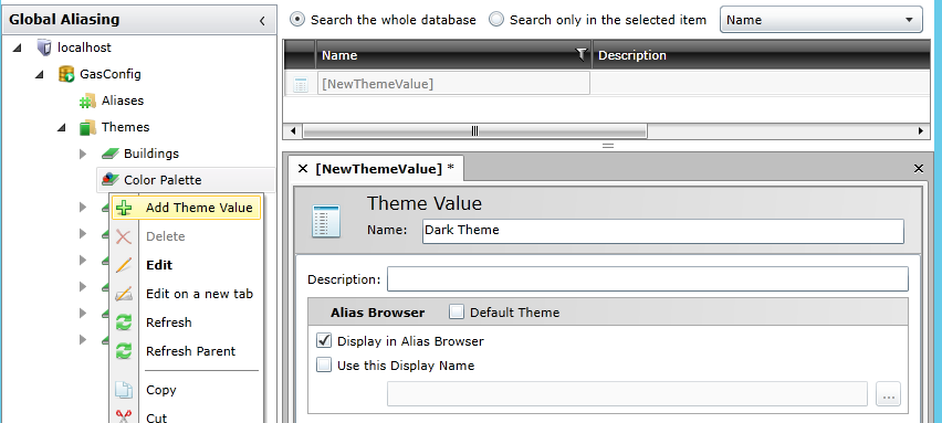 You can also change the description, decide if the connected theme should be the Default Theme, decide if this theme value should be displayed in the Alias Browser and if you wish to use a separate Display Name for this theme value within the Alias Browser (if you click this checkbox, you can enter a different Display Name in the text entry field or click on the ellipsis [...] to select one through the Data Browser). Click 'Apply & Close' to proceed.