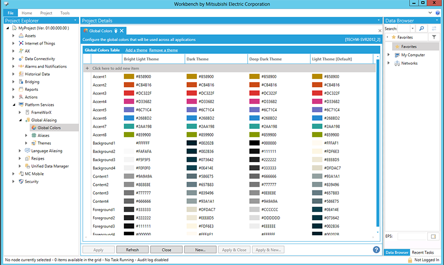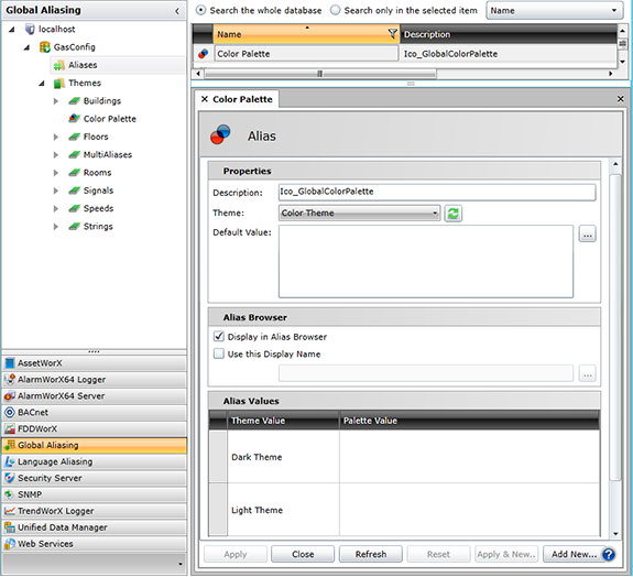 Once you have configured a Global Color Palette within the Global Aliasing provider in the Workbench, you'll be able to make use of the configured Global Colors and Themes within integrated GENESIS64 applications, such as GraphWorX64.