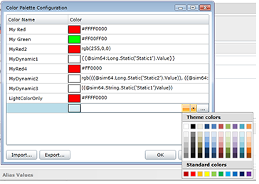 Within the Color Palette Alias properties, you can provide a Description, select the associated Theme (from the pulldown menu) and provide a Default Value (by entering one within the text entry field or by clicking on the ellipsis button [...] and selecting one via the Data Browser.