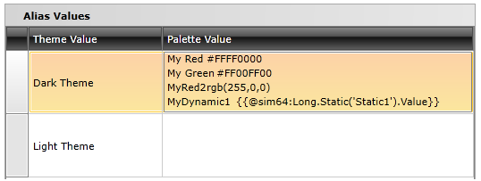 Notice that our 'Dark Theme' and 'Light Theme' Theme Values are listed in the Alias Values section of the Alias properties. In the next step, you'll be able to add Palette Values to these themes.