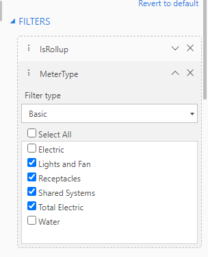 Note: The dashboard filters which are used in single selection mode may have pre-selected values which are based on the source energy sample data that the sample energy dashboard was developed. As such, once the user goes to display runtime mode and selects an existing filter value, the new filter value will take affect and the saved pre-selected filter value will reflect existing values from the user’s energy application.