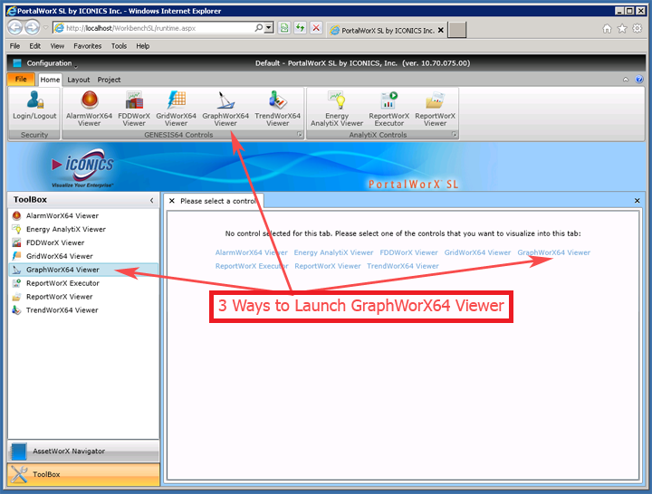 PortalWorX-SL will now open in your selected Web browser, as shown below. You can launch a GraphWorX64 Viewer in multiple ways. You can select it within the GENESIS64 Controls in the Home Ribbon OR you can select it within the main window in the lower right of the PortalWorX-SL browser window OR you can select it from the list within the ToolBox in the left navigation box.
