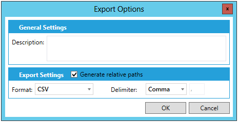 In the Export Settings section, you can opt to Generate relative paths via the checkbox. Use the Format pulldown menu to decide from either CSV, Excel workbook or XML. Use the Delimiter pulldown to decide from either Comma, Tab or Other (if selected, you will be able to enter a delimiter symbol in the activated text entry field).