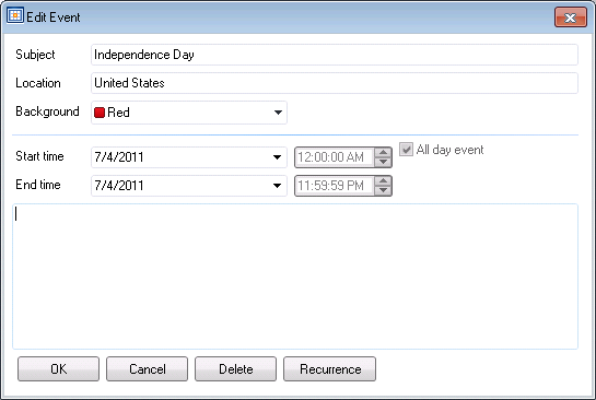 The Edit Event dialog box appears. Enter the Subject and Location in the text entry fields. Use the Label pulldown menu to select a color (for instance, use one color for a shared type of events or different colors to distinguish individual event types). Enter a Start and End time by entering text or using the up and down arrows. The All day event checkbox will be initially pre-checked and grayed out.
