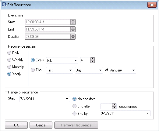 If the event type is recurring, click Recurrence. If the event is not recurring, click OK to return to the main Calendar View tab settings in the ScheduleWorX64 Holiday Properties. If you click Recurrence, the Event Recurrence dialog box appears. The Event Time will be initially grayed out for a full-day holiday event.