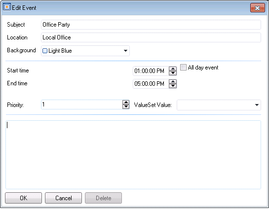 - The Edit Event dialog box is displayed. Enter the subject of the holiday and its location. You can set a Start time and End time. You can also set a numerical priority or a valueset value.