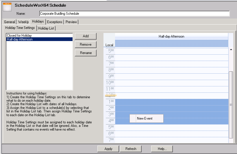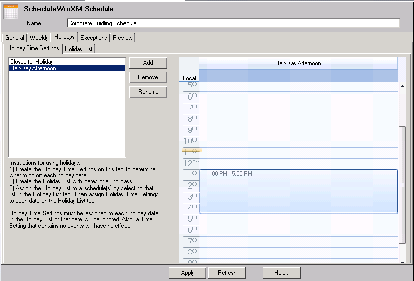 - Click the Apply button to enforce the holiday schedule you just assigned. You can continue to make changes within the other tabs of the ScheduleWorX64 Schedule settings.