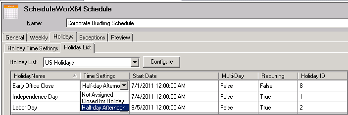 - In the ScheduleWorX64 Configurator, double-click on the schedule to which you want to attach a holiday list. This brings up the ScheduleWorX64 Schedule settings.