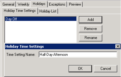 - Click the Add button and in the Holiday Time Settings dialog box enter a name for the holiday time setting you want to create. For example, in the following figure you are defining an afternoon holiday. For example, in the following figure you are defining an afternoon holiday.