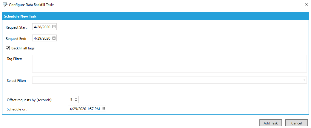 When the Manage Data Backfill Tasks dialog is displayed, the user can add a new task or monitor existing tasks.