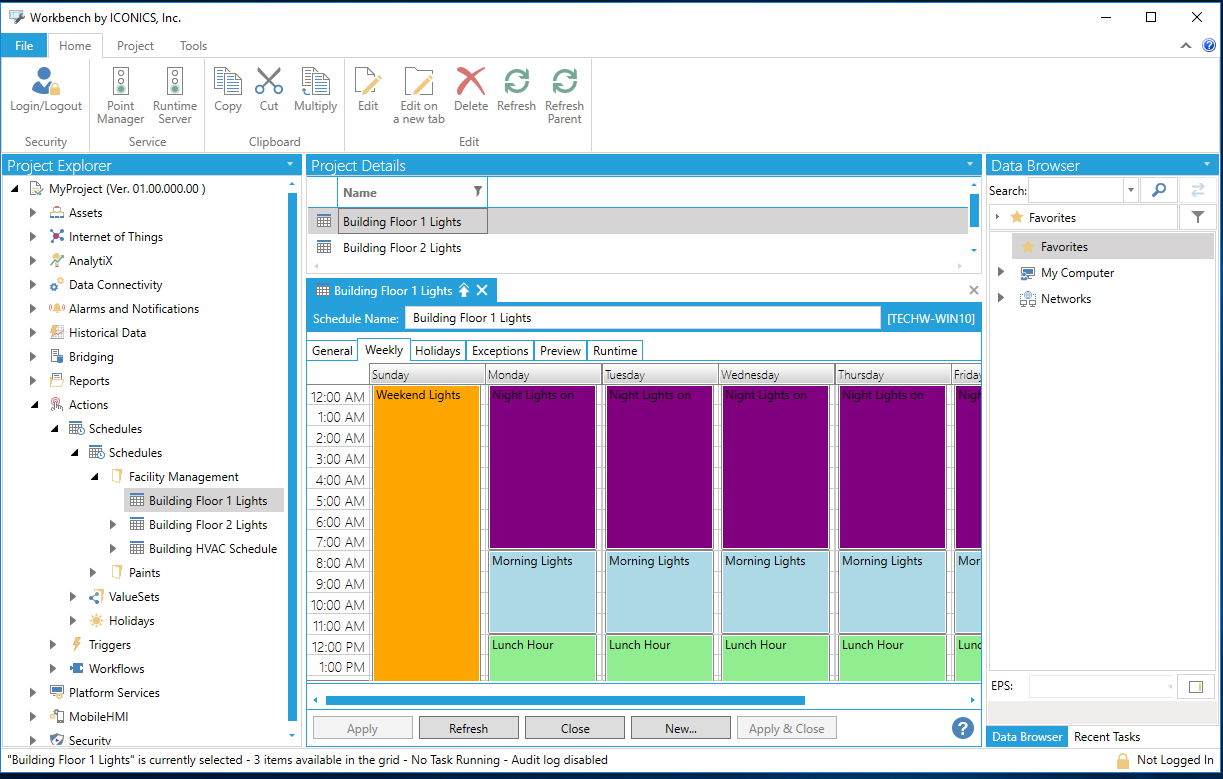 The General, Weekly, Holidays, Exceptions, Preview and Runtime tabs that you see in the schedule properties window below are shown when a schedule item is selected. Additional tabs may appear depending upon the tab you select.