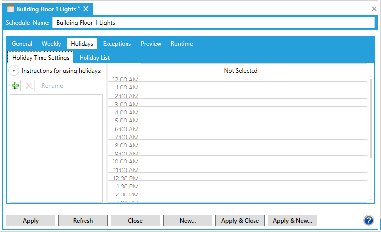 On this tab, you can pick a holiday schedule and assign different holiday events to the different schedules. Holiday schedules are defined with the Holidays node of the Project Explorer. After following the instructions for configuring the Holiday Time Settings, you will be able to see configured holidays on the preview tab. Only the events belonging to a Holiday Time Setting will be displayed.