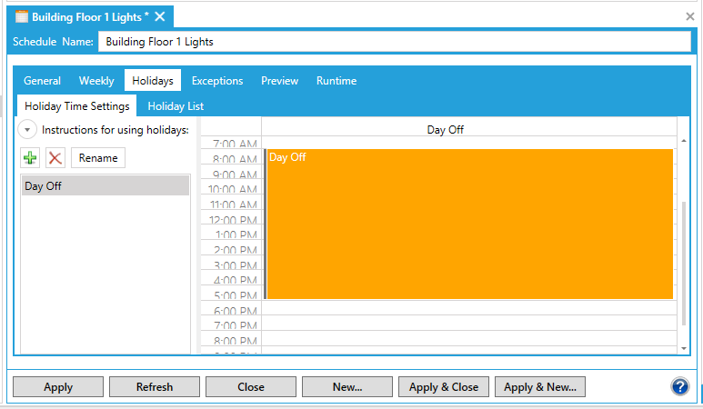 - Create a new Holiday Time Setting by pressing the Add button, and name it "Day Off". Click OK.