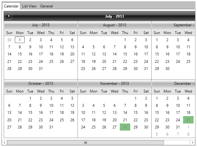 The Calendar Tab of the Schedule Control (from a BACnet Calendar View configuration) Runtime properties is the primary calendar display for your users. The tab initially contains a six-month display, as shown below. You can move forward or back (in six month increments) using the Back [<] and Forward [>] arrows.