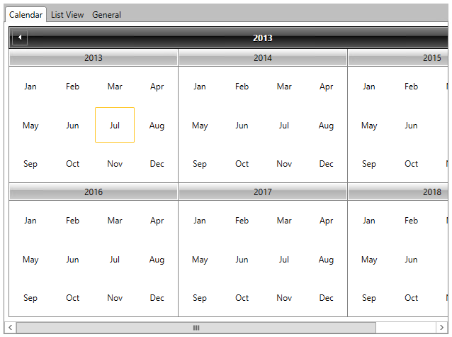 Clicking on the top Month/Year text changes to a six-year view, where you can select a different Month/Year. As with the six-month view, you can move forward or back (in six year increments) using the Back [<] and Forward [>] arrows.