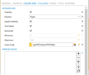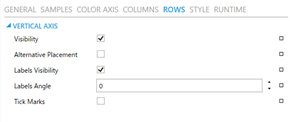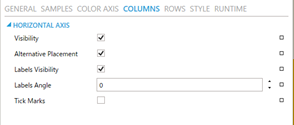 The Color Axis, Columns, and Rows pages configure the three axes. You can choose to hide labels and/or tick marks and set visibility and position. For the Color Axis, you can also define its minimum and maximum values, either as a static number or as a dynamic data source.