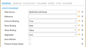 On the General page, you can define an aggregate to use when calculating sample values. If the server supports runtime updates, enable Auto-Refresh to process them. You can choose to keep the row or column binding empty; in which case the data diagram will show a single row or column of samples.