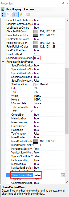 Set “SpecifyRuntimeWindowProperties” to True. Note: You can set this wherever there are RuntimeWindowProperties, like in a LoadDisplay pick action or an embedded GraphWorX64 Viewer or in the “New This Display Default Settings” part of the preferences (which will set the default for new displays you create).