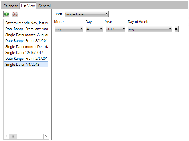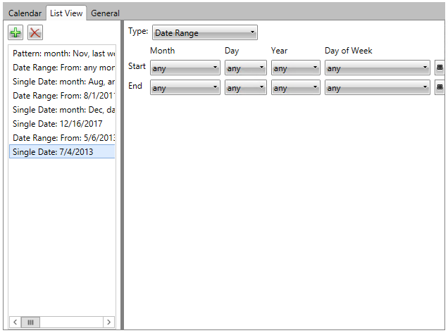 Clicking on the green plus [+] button allows you to add a new list item, while clicking on a list item and then on the red [X] button removes it. Your chosen BACnet Device's Object may come with several existing schedule items, as shown in the image above. You can click on an existing item and edit its Type and calendar information.