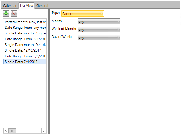 Pattern - You can use the pulldown menus (for Month, Week of Month and Day of Week) to set a recurring date pattern.