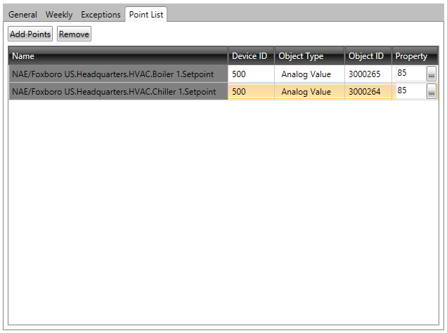 The Point List tab of the of the Schedule Control (from a BACnet Schedule View configuration) Runtime (Calendar View) allows users to add points (objects) related to the set schedules/exceptions.