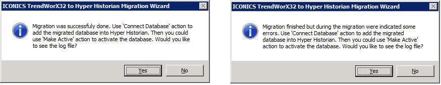 1. Click Yes to see the log file. A successful migration looks something like the following. If there were errors or warnings, refer to the Troubleshooting section below. Otherwise, proceed with the migration steps.