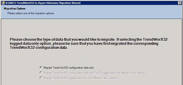 1. Click Next. The Migration Options dialog appears, as shown below. The Migrate TrendWorX32 configuration data only option is selected for you.