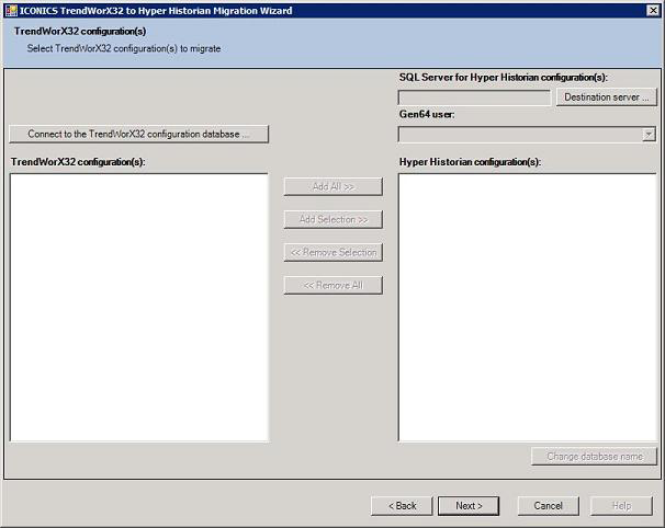 1. Now you have to select the Hyper Historian configuration where the TrendWorX32 data is to be migrated to. To do this, in the top-right corner, click the Destination Server button and use the Destination Server Wizard to choose the server. Then, from the Gen64 User drop-down list, select the user ID -- it is recommended that you select the ICONICS_USER. Regardless, make sure that your GENESIS64 user that you choose has permissions to access the TrendWorX32 configuration database.