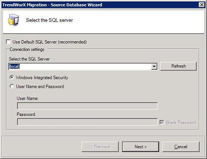 1. Click the Connect to the TrendWorX32 Configuration Database button. This launches the Source Database Wizard, shown below. It is recommended that you check the Use Default SQL Server checkbox. If you cannot, uncheck the check box to expand the prompts; you will be prompted for the following information: