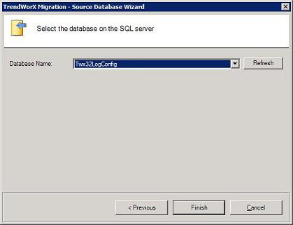 1. Select the database where the data to be migrated resides, and click Finish. The Database Wizard closes and returns you to the TrendWorX32 to Hyper Historian Migration Wizard with the TrendWorX32 database populated and all of its configurations showing in the TrendWorX32 Configuration(s) box, as shown below.