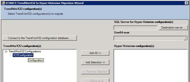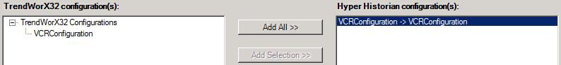 1. From this list, select the configuration you want to import into Hyper Historian. If there are others, select those too. Then click the Add Selection button. This adds the selected configurations to the Hyper Historian Configuration(s) box on the right, as shown below. (Clicking Add All adds all of the database's configurations the to Hyper Historian Configuration(s) box.)
