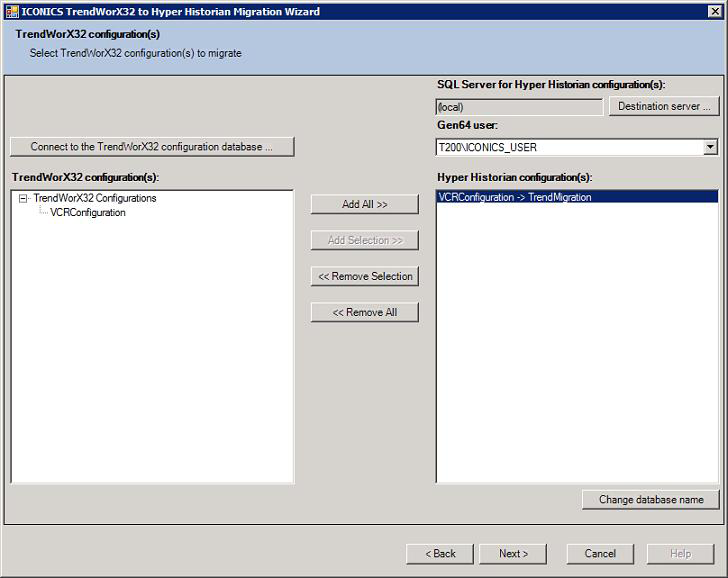 2. You can specify the name of the Hyper Historian configuration database to which the TrendWorX32 configuration is to be migrated. By default, the Migration Wizard gives it the same name as the TrendWorX32 configuration database. (In the example above, you can see the entry as "VCRConfiguration -> VCRConfiguration".)