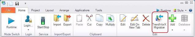 2. In the ribbon's Home tab, click the TrendWorX Migration button, circled in the following illustration.