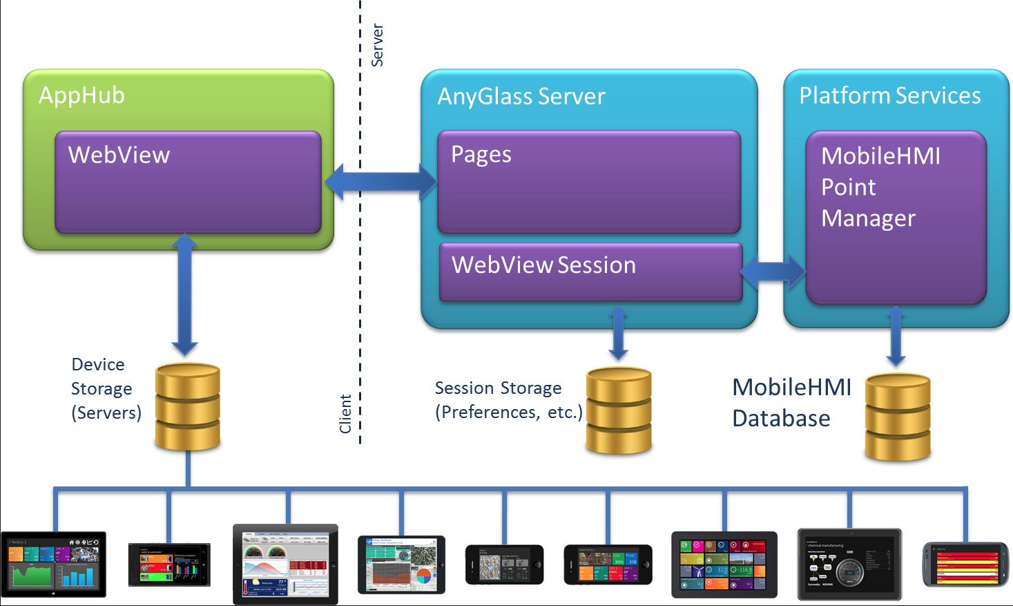 For HTML5 devices, the server-side Point Manager queries information from the MobileHMI database and forwards the results to an AnyGlass server, which stores the layouts, groups, and tiles you view on your device. This server also stores information about your current AppHub session using the AppHub domain model, the asynchronous IRepository, the FrameWorX client repository, and an asynchronous FrameWorX client. Your device communicates with a single, dedicated instance of the AnyGlass server to view your configured AppHub elements. Your device also stores a list of servers to which you can connect.