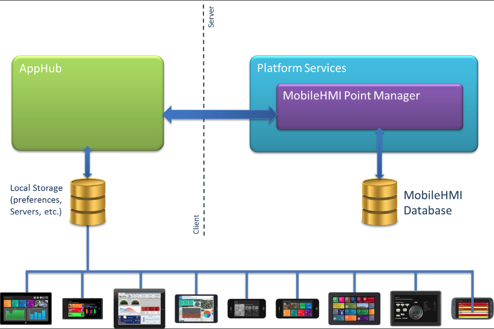 For WinRT devices, the server-side Point Manager queries information from the MobileHMI database and pushes the results onto your device, where the AppHub domain model, asynchronous IRepository, FrameWorX client repository, and asynchronous FrameWorX client reside. Your device also stores your AppHub preferences and the list of servers to which you can connect.