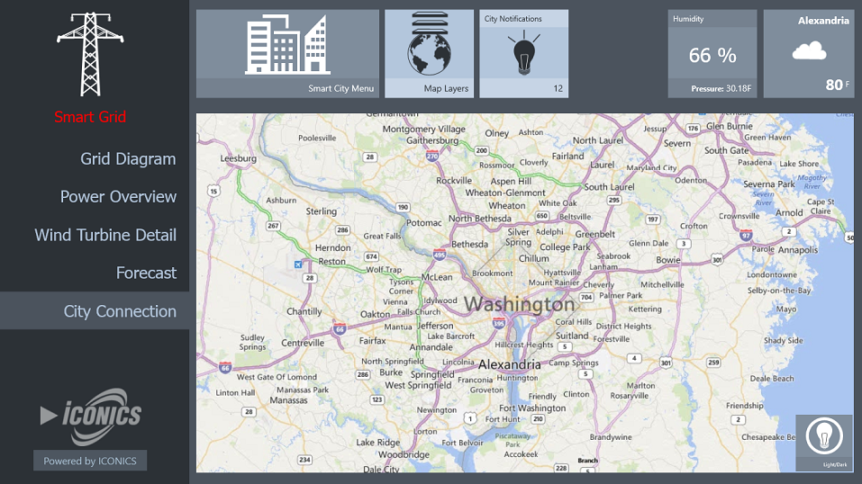 The EarthWorX Viewer for MobileHMI behaves similarly to Desktop EarthWorX. By embedding a GraphWorX control with an EarthWorX displays, users can access GEO-SCADA mapping from MobileHMI-supported devices. An EarthWorX display for MobileHMI is fully interactive and can display as shown below embedded in a GraphWorX64 MobileHMI display. Offering Google, Bing, and Esri map systems as well as scalable vector graphic layers, ICONICS users can contextualize and customize their data visualizations with EarthWorX.