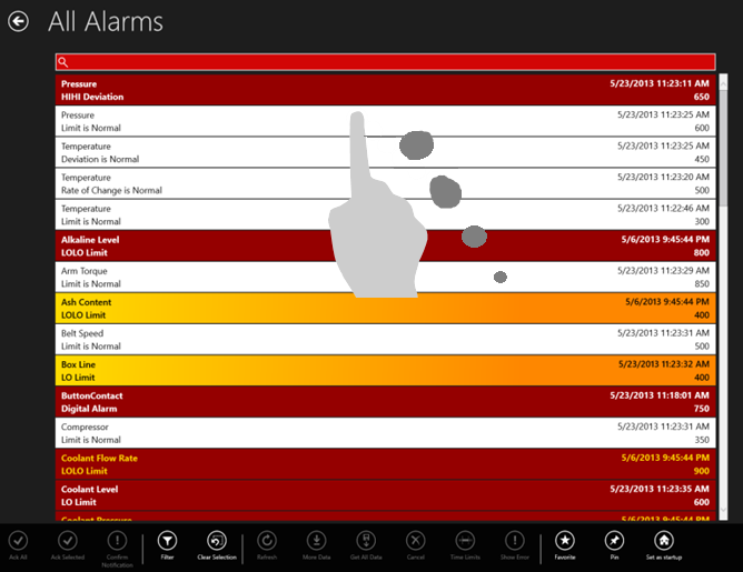 You can interact with a list of alarm notifications in the AlarmWorX64 Viewer using a variety of hand motions on your mobile device screen. Descriptions and examples of these gestures appear below.