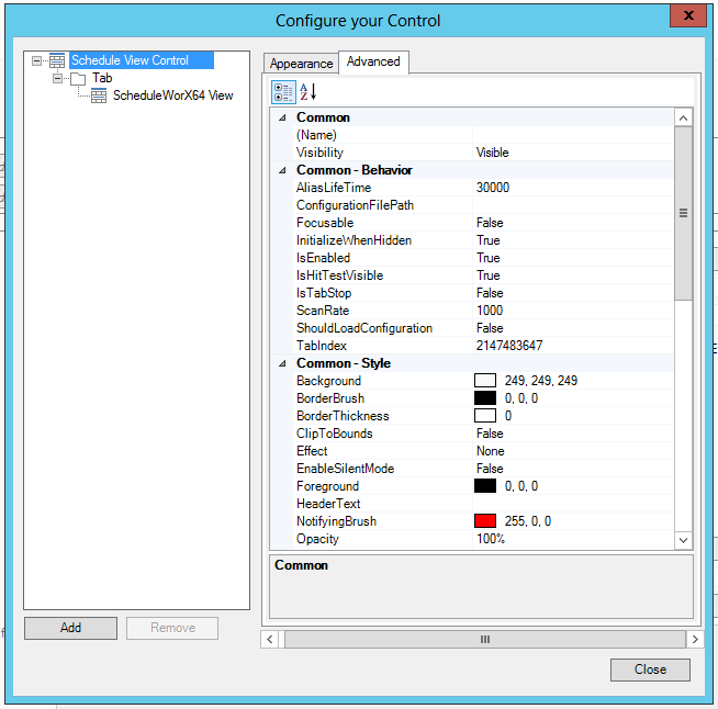 From here, the user can customize Common, Common-Behavior, Common-Style, Measurements, Misc-Commanding, Text, ToolBar and the Visual Quality of the Schedule View Control.