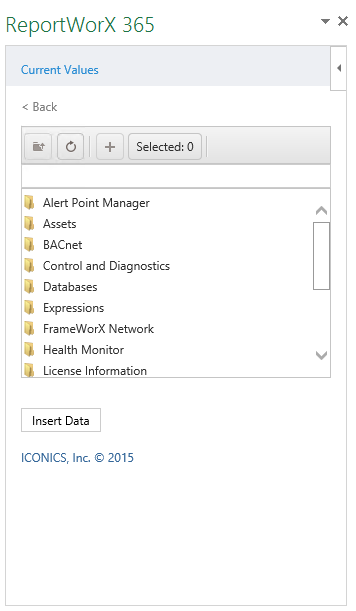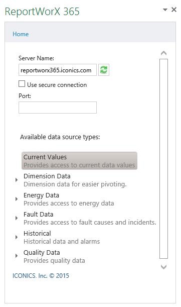 In the ReportWorX 365 add-in, select the Current Values data source type, as shown below.