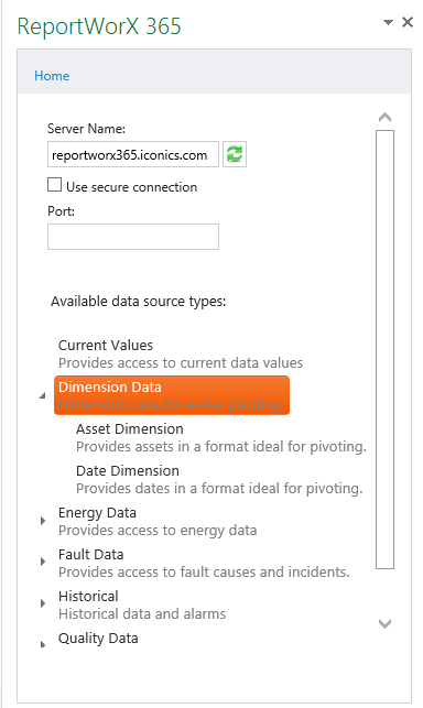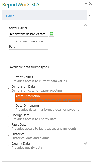 In the ReportWorX 365 add-in, select the Dimension Data data source type, and then the Asset Dimension data source type, as shown below.
