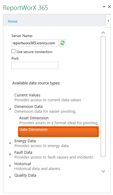 In the ReportWorX 365 add-in, select the Dimension Data data source type, and then the Date Dimension data source type, as shown below.