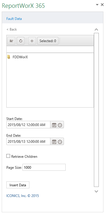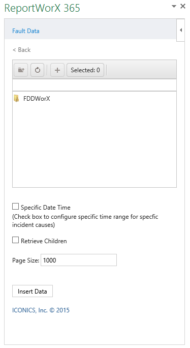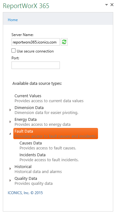 In the ReportWorX 365 add-in, select the Fault Data data source type, and then the Incidents Data data source type, as shown below.