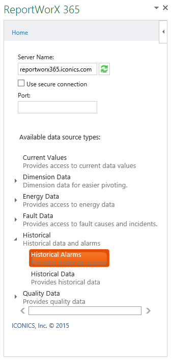 2. In the ReportWorX 365 add-in, select the Historical data source type, and then the Historical Alarms data source type, as shown below.