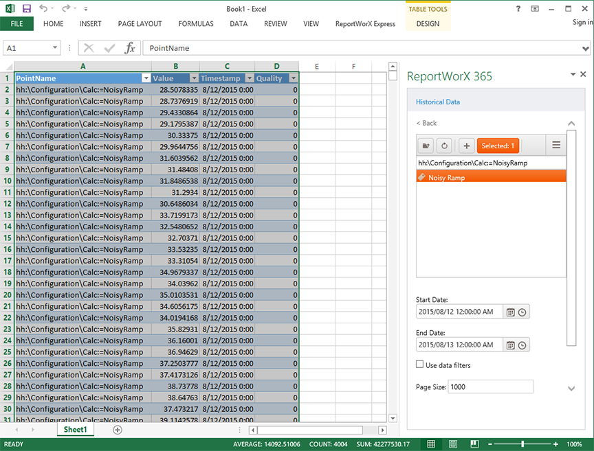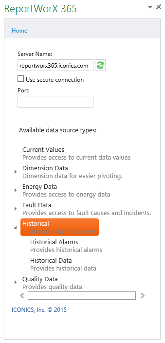 Selecting Historical as a data source in ReportWorX 365 allows you to pick from either Historical Alarms or Historical Data. These sources provides access to historical data and alarms for use within Microsoft Excel.
