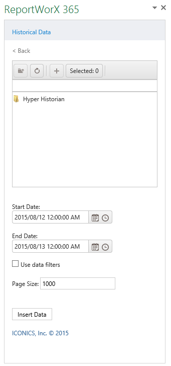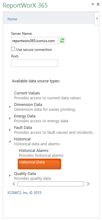 2. In the ReportWorX 365 add-in, select the Historical data source type, and then the Historical Data data source type, as shown below.