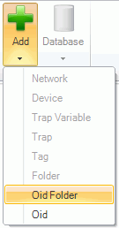Select an MIB folder (an Oid folder) in the tree control of the SNMP Connector in the GENESIS64 Workbench, then click on the Add button in the Edit section of the Home ribbon, then click Oid.